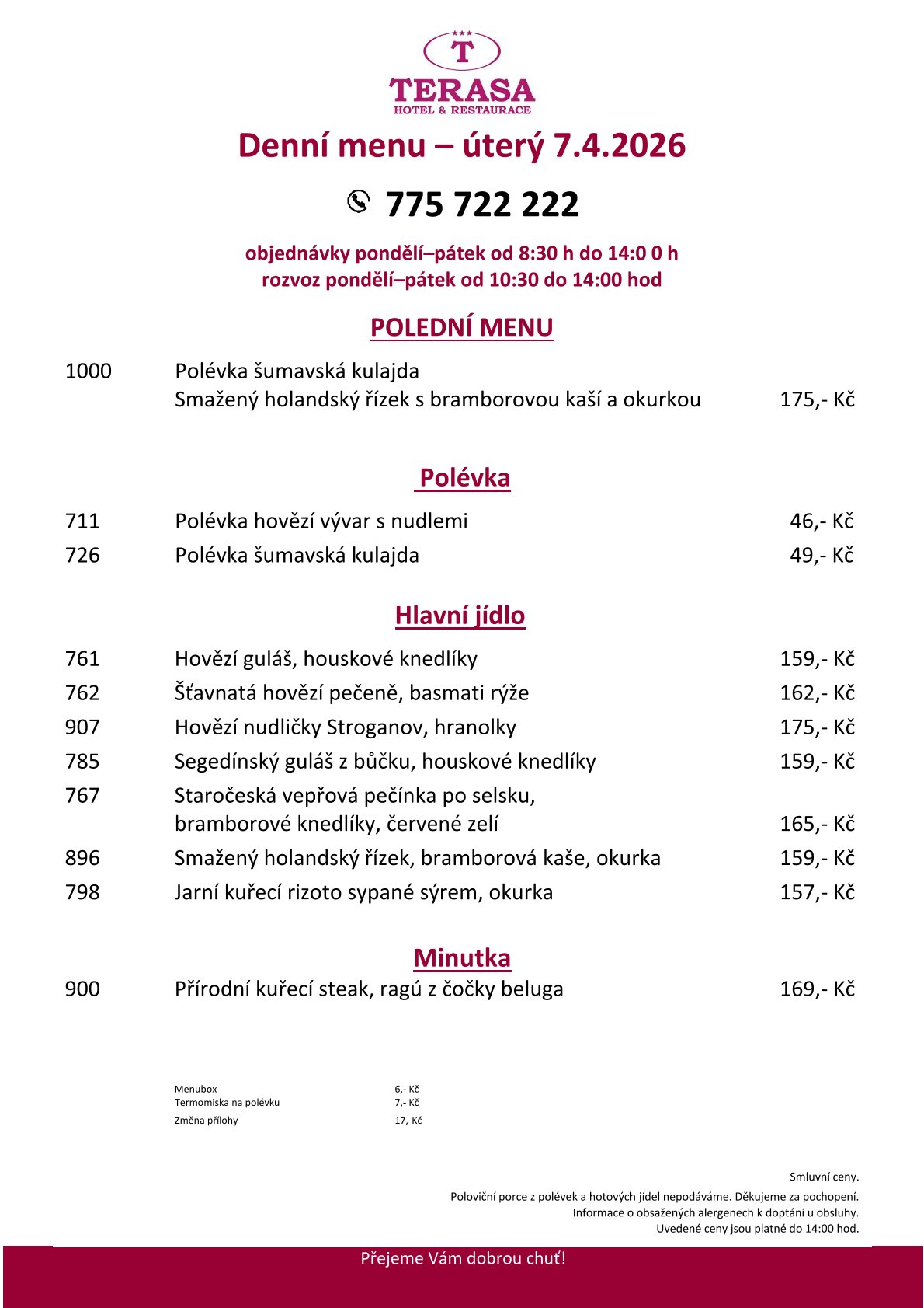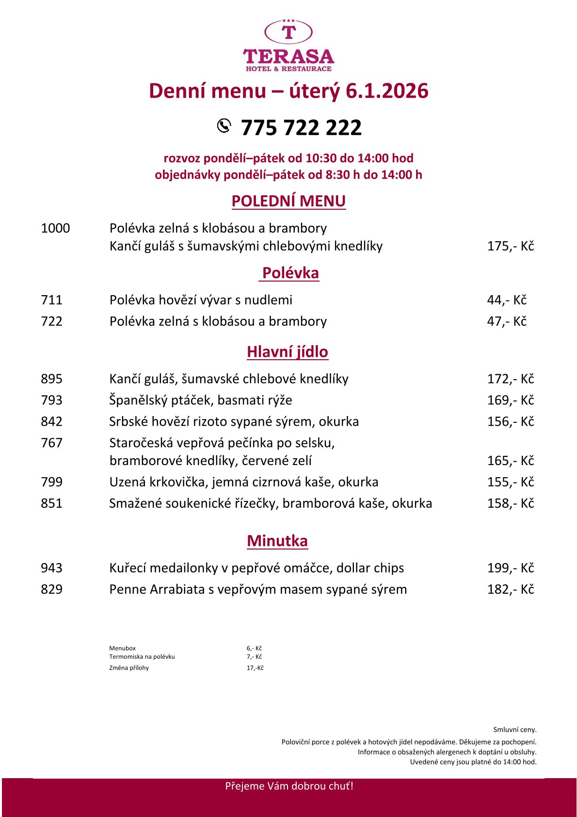Od pondělí do pátku si můžete vybrat ze široké nabídky hotových jídel, které vždy připravujeme z čerstvých a pečlivě vybraných surovin.