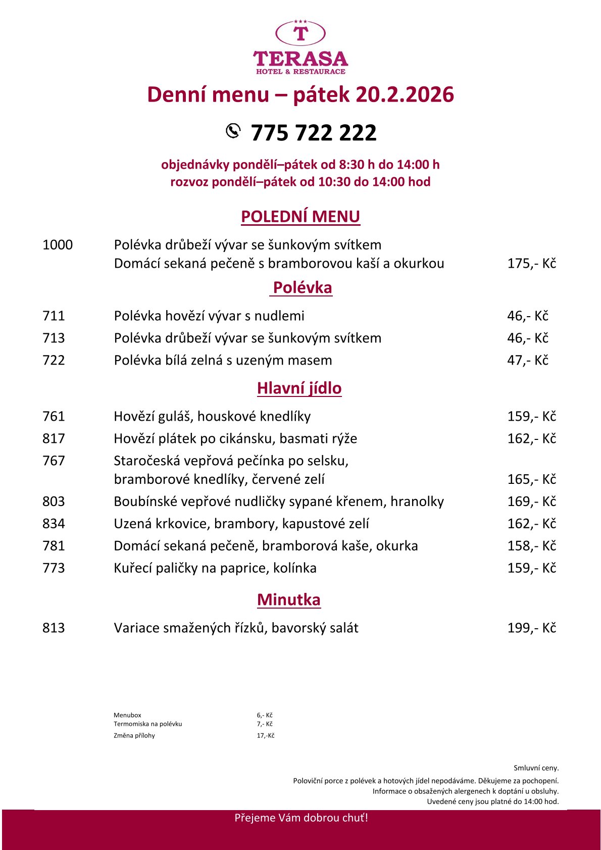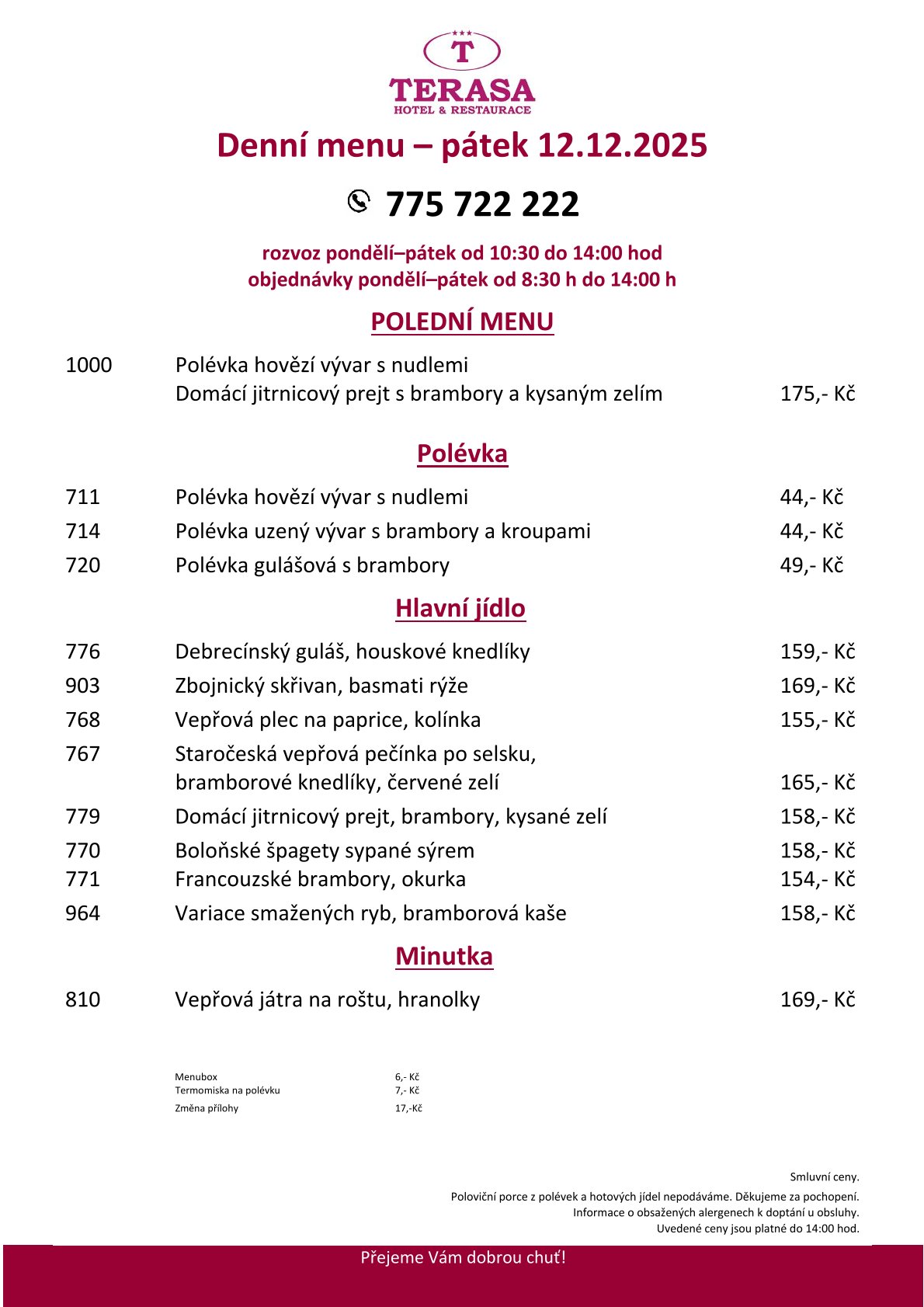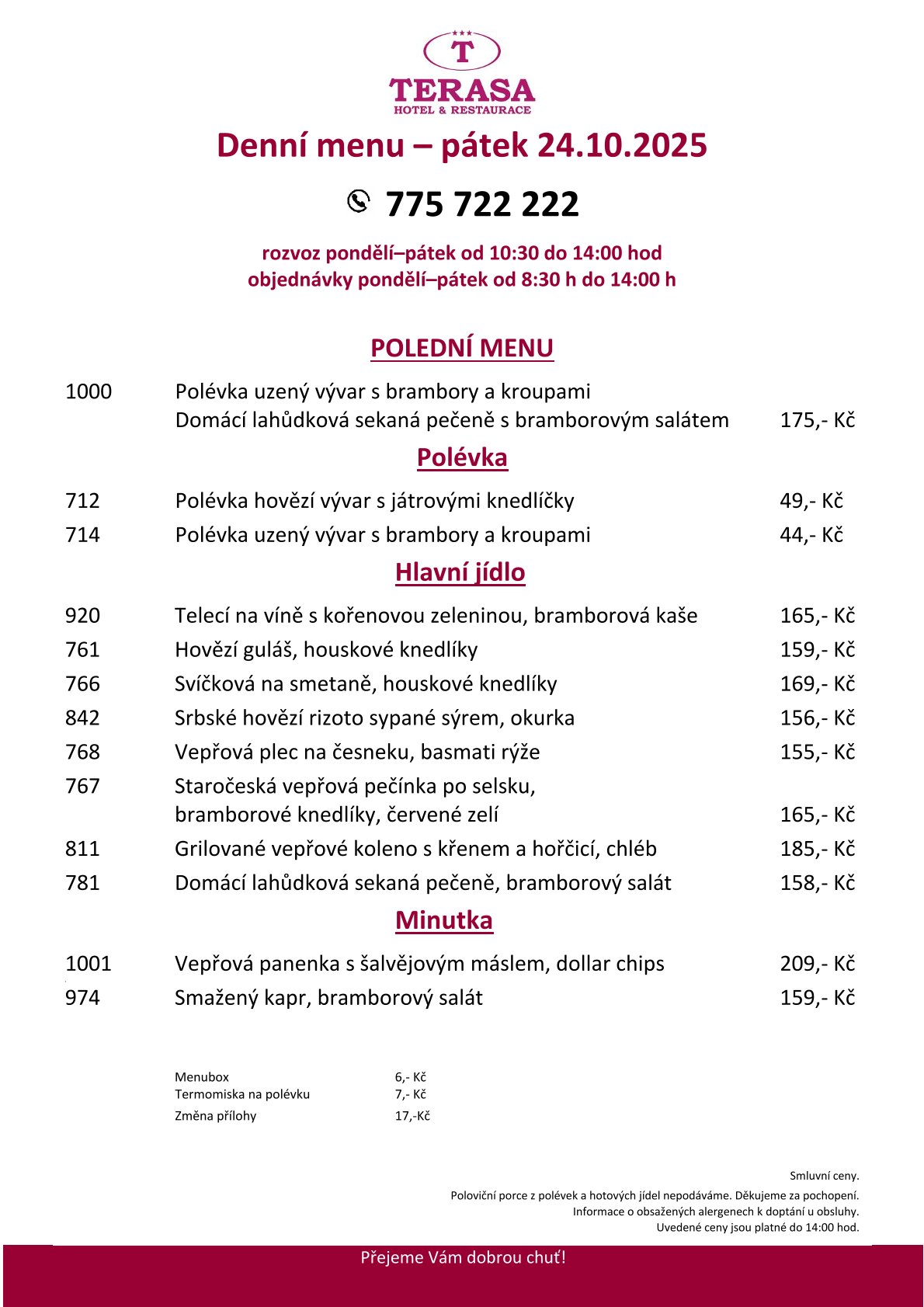 Od pondělí do pátku si můžete vybrat ze široké nabídky hotových jídel, které vždy připravujeme z čerstvých a pečlivě vybraných surovin.