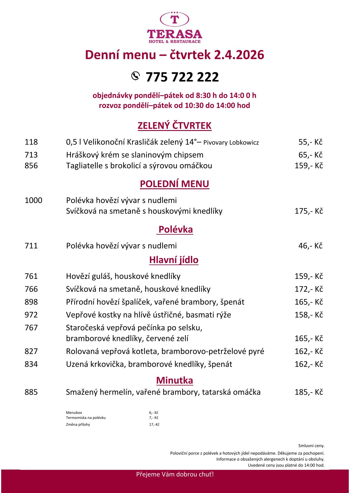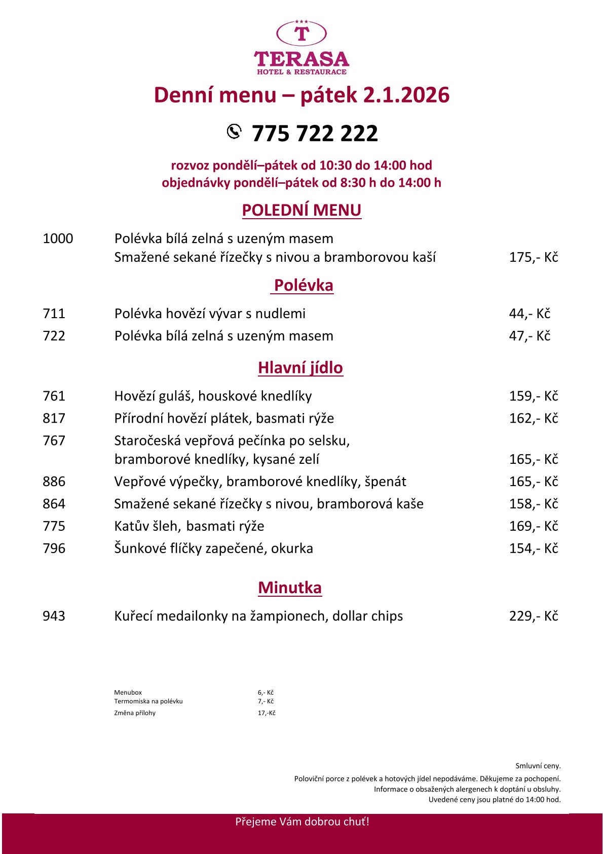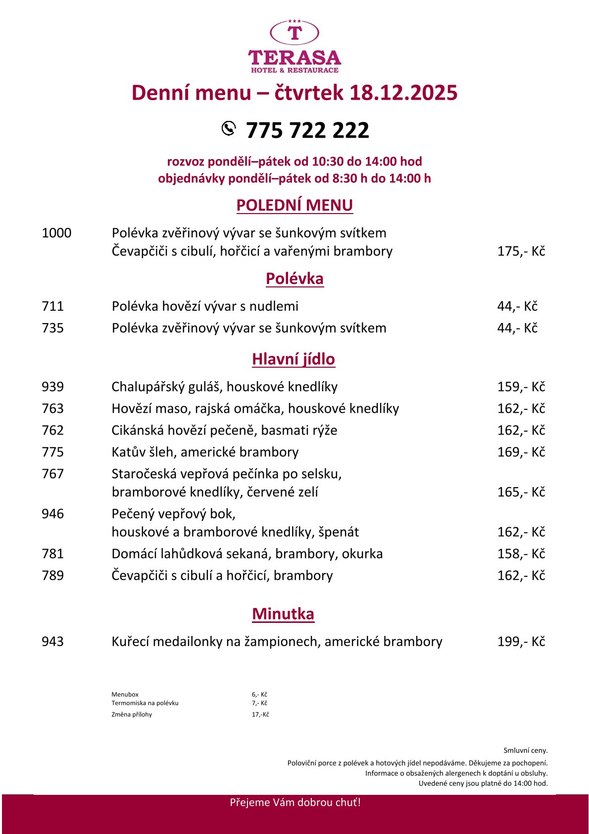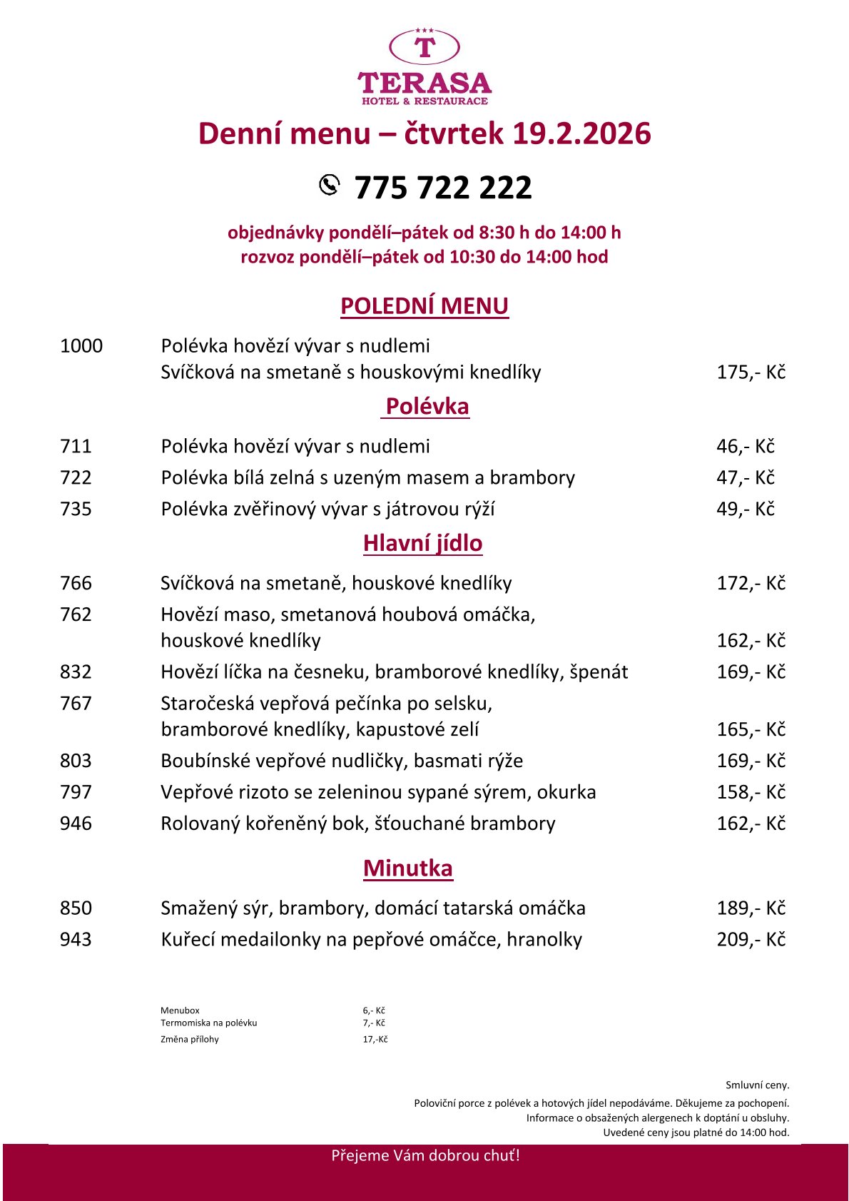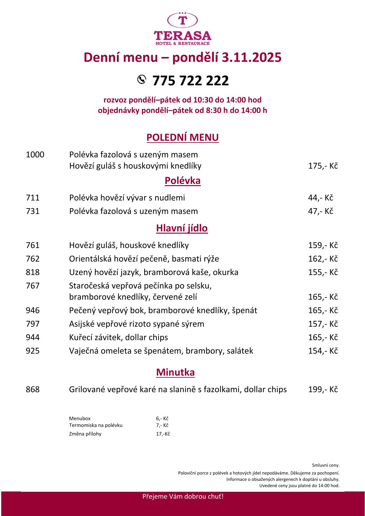 Od pondělí do pátku si můžete vybrat ze široké nabídky hotových jídel, které vždy připravujeme z čerstvých a pečlivě vybraných surovin.